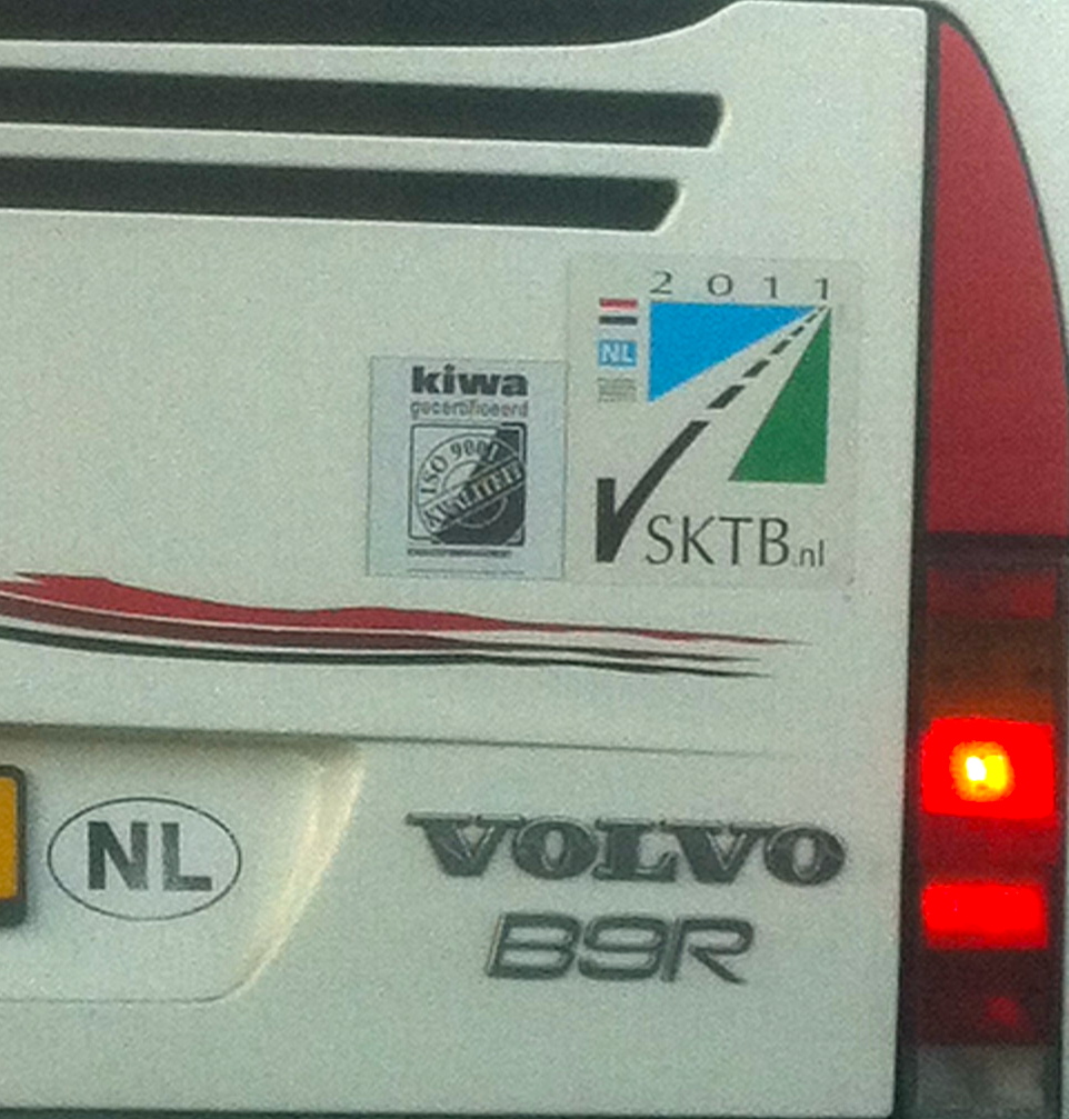 Noem het beroepsdeformatie, maar ik kan het nooit laten een foto te maken wanneer ik er onderweg eentje zie, zo'n 'Kijk-ons-eens-gecertificeerd-zijn-sticker'. Nou ja, als het veilig kan dan. Nee, heus, veiligheid voor alles. Maar hoe meer ik nou vertel dat er best veel bedrijven zijn die heel slim op hun wagen (i.o.d) communiceren dat ze gecertificeerd zijn, hoe meer het u ook op gaat vallen. Neem de foto hierboven bijvoorbeeld, van de bus van een bekende touringcarclub. Keurig ISO 9001. En ze zijn er trots op, terecht.